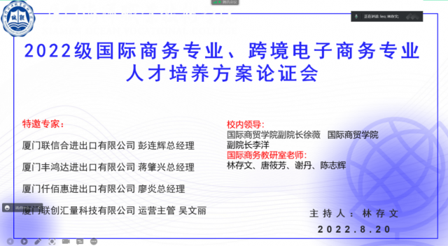 为更好地提升我院人才培养质量,我院国际商务教研室于8月20日晚特邀行业企业专家,召开线上人才培养方案论证会,对国际商务专业和跨境电子商务专业2022级人才培养方案进行专业论证。厦门联信合进出口有限公司、厦门丰鸿达进出口有限公司、千佰惠(厦门)进出口有限公司、厦门联创汇量科技有限公司等企业的总经理和运营主管受邀参加了本次论证会。