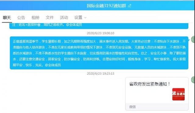 我系吕文庭老师通过与班级联络员进行视频聊天,了解班级同学目前安全动态,班级联络员向她报告班级同学目前安全动态,她也详细地通过班级qq 群通知、文件学习、微信公众号相关内容推送、班委特别强调等方式,提醒同学们务必注意:不准私自下水游泳,不准擅自与他人结伴游泳,不准在无家长或教师带领的情况下游泳,不准到无安全设施、无救援人员的水域游泳,不准到不熟悉的水域游泳,不准不熟悉水性的学生擅自下水施救,切实提高防溺水的警惕性和自觉性。安全无小事,除了要防溺水,还要注意交通安全,居家安全,防诈骗安全,防高利贷等。