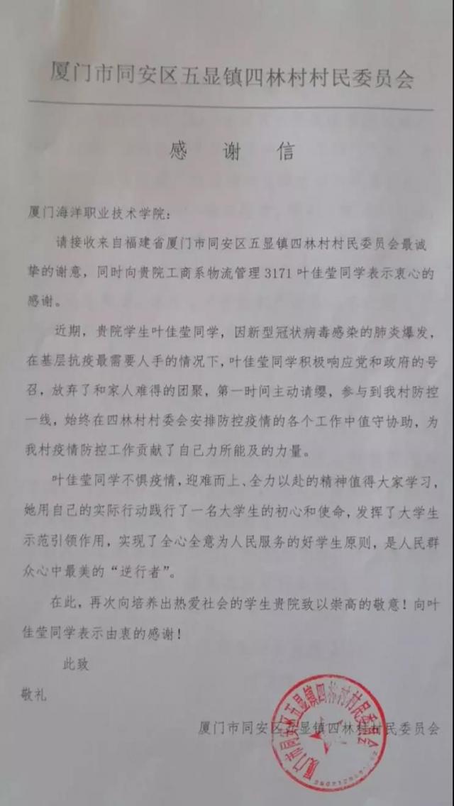 近日,学院收到来自厦门市同安区五显镇四林村村民委员会的一封感谢信,信中提到“近期,贵院学生叶佳莹同学,因新型冠状病毒感染的肺炎爆发,在基层抗疫最需要人手的情况下,叶佳莹同学积极响应党和政府的号召,放弃了和家人难得的团聚,第一时间主动请缨,参与到我村防控一线,始终在四林村村委会安排防控疫情的各个工作中值守协助,为我村疫情防控工作贡献了自己力所能及的力量”。
