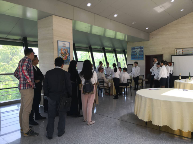 会后,调研组前往歌诗达实训大楼,参观歌诗达邮轮公司中国培训中心,体验邮轮真实场景的前厅实训室、酒吧实训室、客舱实训室等,并现场观摩菲律宾籍外教餐饮实训课程教学示范。调研组一行还参观酒店管理系实训大楼,参观烘焙教室、酒店智能化实训室、中西餐教室、咖啡实训室、清洁实训室、茶艺教室、红酒酒窖等,对邮轮专业、旅游专业在实验教学的开展、实训室的管理等方面进行进一步的学习和交流。