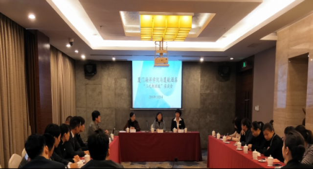 2019年1月21日上午,在工商系副主任徐薇老师的带领下,二元制班班主任李辉老师及旅游管理专业郑晋华老师一行来到厦门航空金雁酒店进行旅游管理专业“二元制”班第一学期期末学生座谈会,企业出席人员有酒店人力部林跃真经理及二元制班的26名学员。