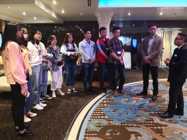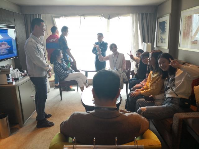 随后,同学们在歌诗达邮轮船务(上海)有限公司销售总经理沈泳兵带领下,通过船员安检通道登陆歌诗达邮轮新浪漫号。新浪漫号邮轮总吨位5.7万吨,船长220.6米,船宽30.8米,载客量1800人,是一艘有着现代化风格的豪华邮轮。在新浪漫号邮轮客户经理Tommy Wong引导下,同学们了解新浪漫号邮轮结构及邮轮部门分配,先后参观各楼层分布情况,健身中心、博奕中心、酒吧、多功能厅、剧院、特色餐饮店、免税店、SPA中心、甲板、客户内部内置摆设等。