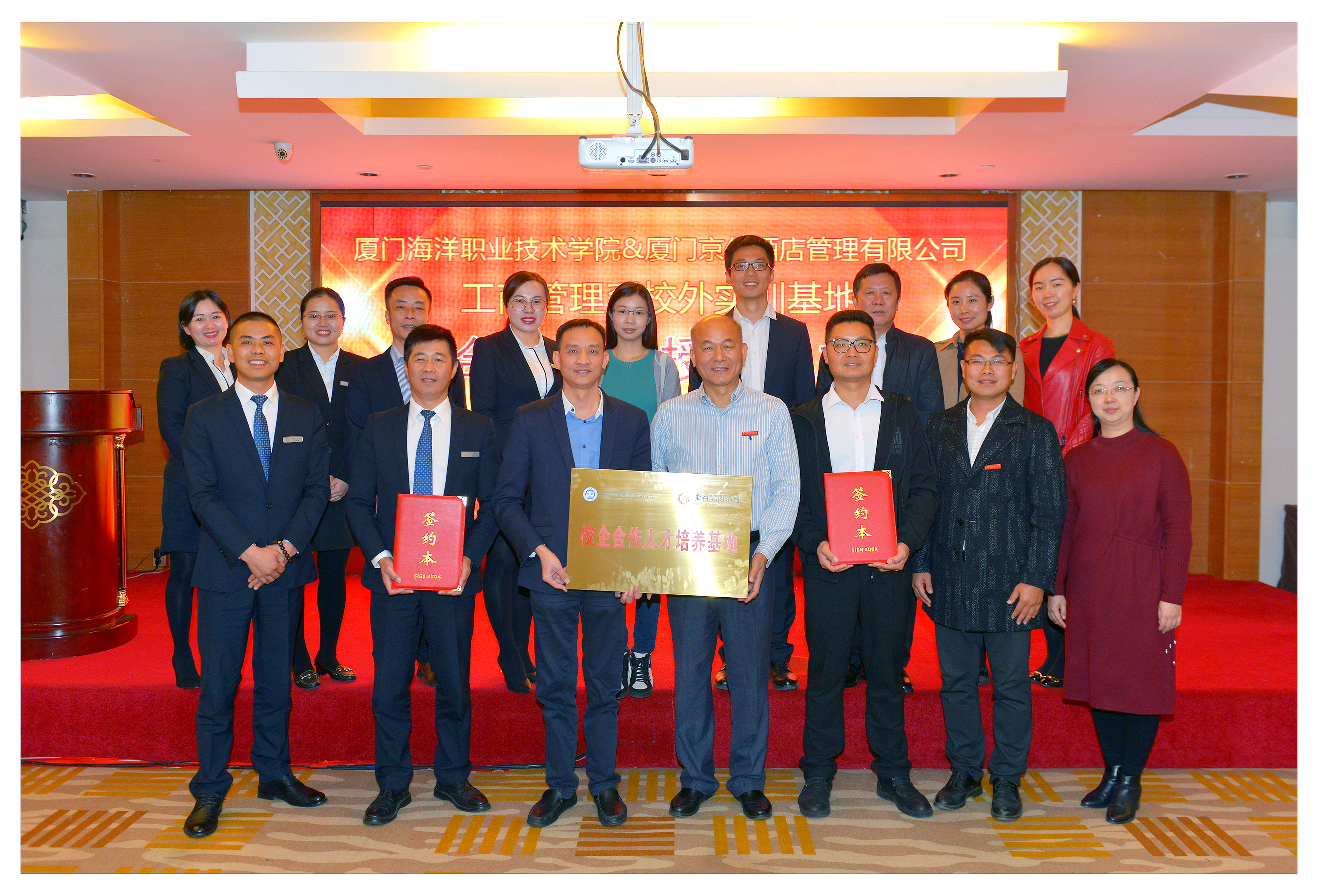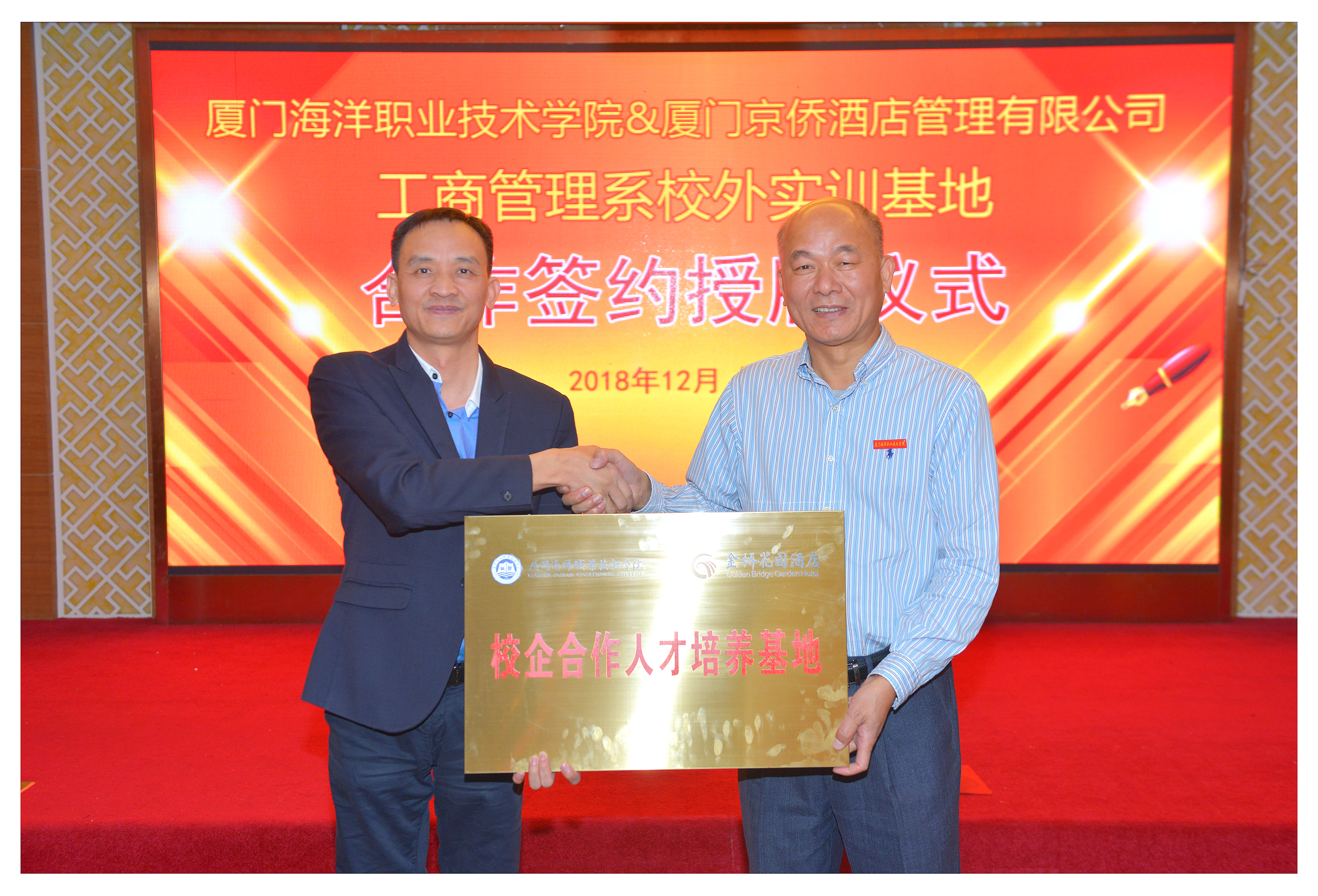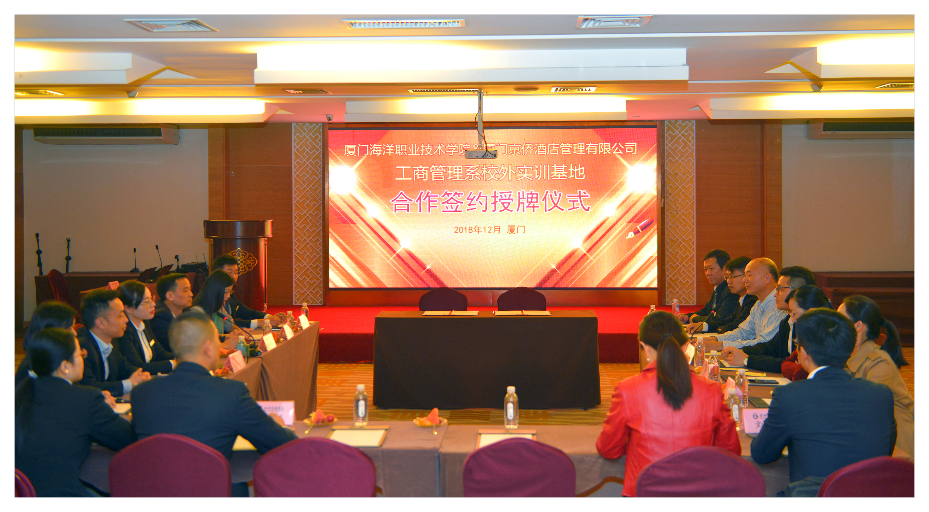 2018年12月18日,我系与厦门金桥花园酒店校外实训基地合作签约授牌仪式在金桥花园酒店隆重举行。厦门金桥花园酒店董事长王宗顺,总经理朱克芳,销售总监郭成环等;我院党委副书记汤忠民、院学生处副处长洪洲培、工商系党总支副书记张宇泉、旅游管理专任教师潘勤奋、李辉以及辅导员等出席本次签约仪式。
