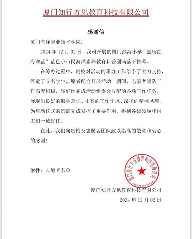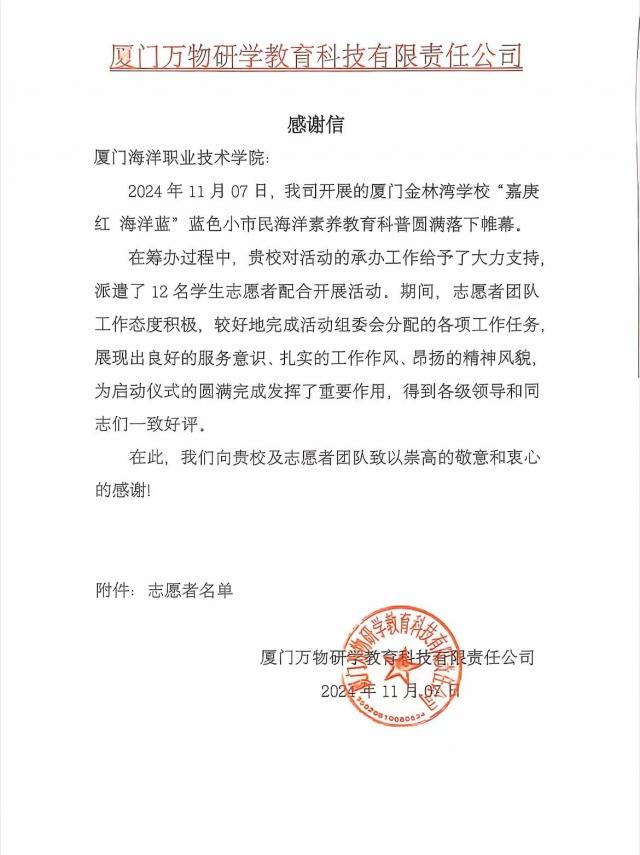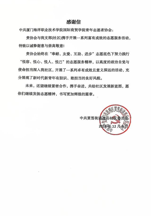 志愿于心,奉献于行。2024年,国际商贸学院青年志愿者协会举办228场志愿服务活动,涵盖支教助学、环保公益、社区关爱等多个领域,探索了“青商青行”、“非遗润童心”等志愿服务新品牌5项,并创建了“益童成长”、“嘉言懿行”等志愿服务专项小队10支,与莲岳社区居委会、江头社区居委会、翔安区金山小学、厦门科技馆、同心儿童及家庭帮扶中心、翔安区图书馆等多个校外机构展开志愿服务合作,累计志愿服务人次达4900人次,总服务时长近9000个小时,受众达2.1余万人,2024年获评厦门海洋职业技术学院“优秀志愿服务组织”称号,收获来自翔安区卫健局、厦门市科技馆、莲岳社区委员会等感谢信6封,带动我院青年学子将信念转为勇立潮头的出发点,将知识化作挺膺担当的源动力。