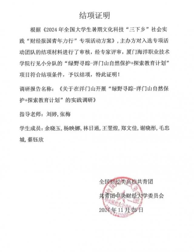 学院团总支积极组织开展“三下乡”、“返家乡”等社会实践活动,鼓励学生投身八闽大地,在为乡村带去专业服务的同时,帮助学生认识理论与实际的差距,在解决实际问题中找到平衡点,提高自身的综合素质和能力。其中,“行见小分队”三下乡实践队获2024年全国大学生暑期三下乡社会实践“财经报国青年力行”专项活动立项并圆满结项,是福建省入选的六支团队之一。