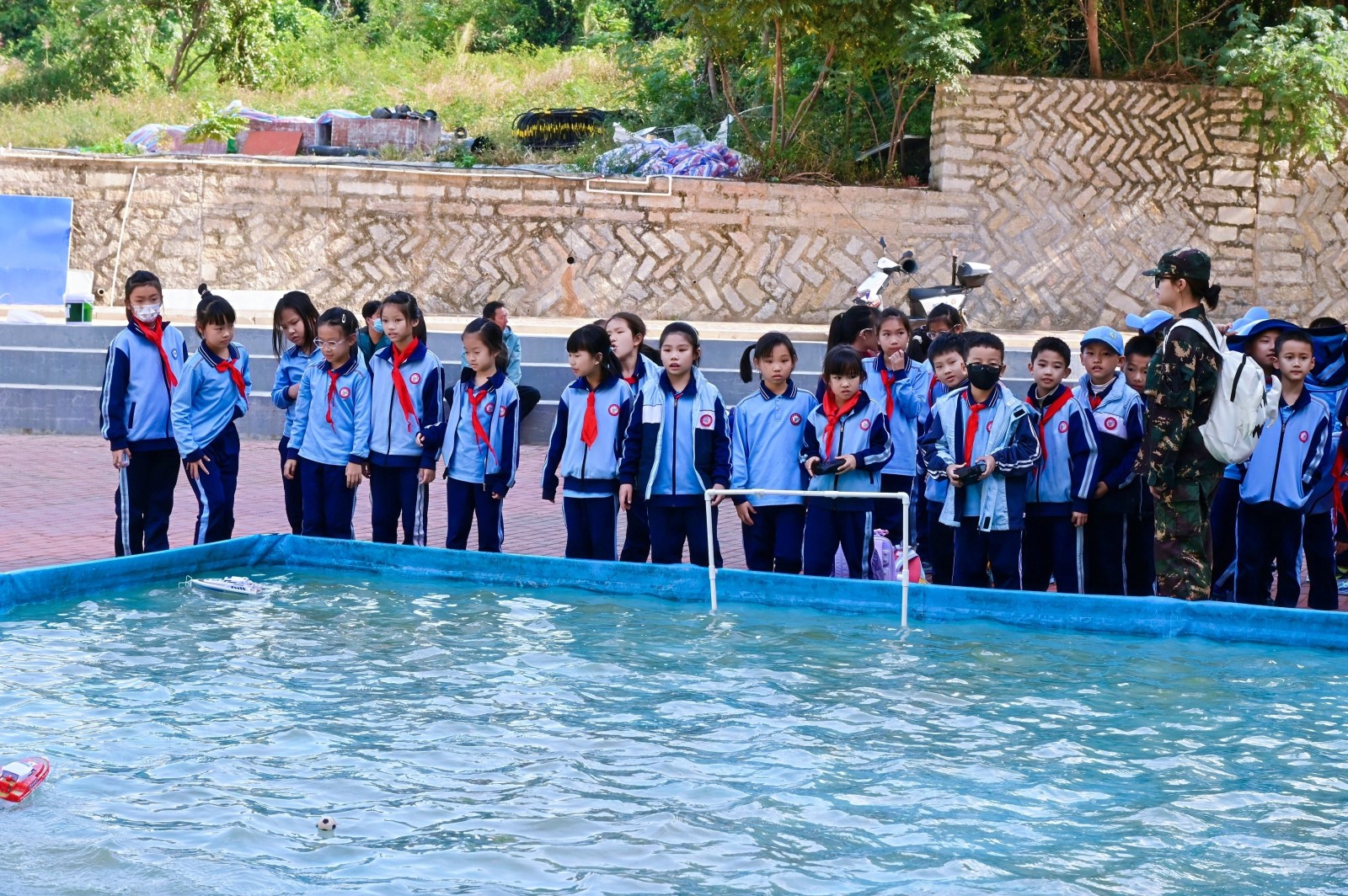 最热闹的“水上足球狂欢”环节,将研学的快乐推向高潮。水池边,孩子们手握遥控杆,眼神专注地操控船模——有的灵活调整方向,让船模精准“追球”;有的和同伴默契配合,一个“传球”一个“射门”。当船模成功将“足球”撞入“球门”时,欢呼声、笑声在现场回荡。这场趣味比赛,不仅考验了孩子们的手眼协调能力,更让他们在团队协作中感受科技与运动碰撞的魅力,对航海模型的操控原理也多了一份直观认知。