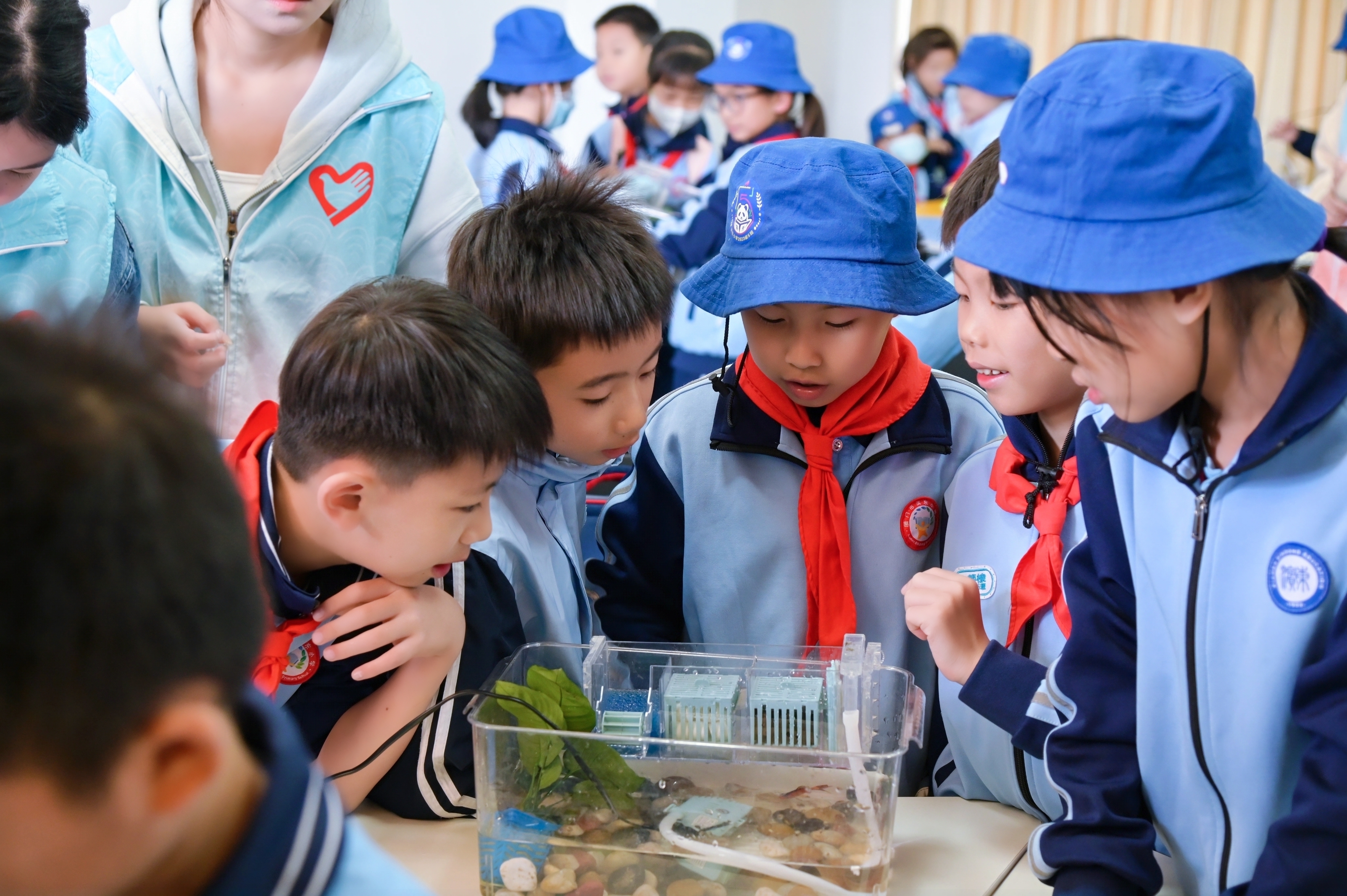 步入水循环系统实验室,动手探索的乐趣瞬间拉满。老师用生动的演示,将蒸发、凝结、降水、径流的水循环过程,变成了一场“小水滴的奇幻旅行”——从水面升起的“白雾”到凝结成的“小水珠”,每一个环节都让孩子们看得目不转睛。随后,孩子们化身“生态小工程师”,小心翼翼地在鱼缸里铺鹅卵石、种水草,再轻轻放入灵动的小金鱼。当看到自己搭建的微型水生系统里,水草舒展、鱼儿游动,孩子们眼中满是成就感,也真正读懂了“水资源珍贵”与“生态平衡”的深层意义。