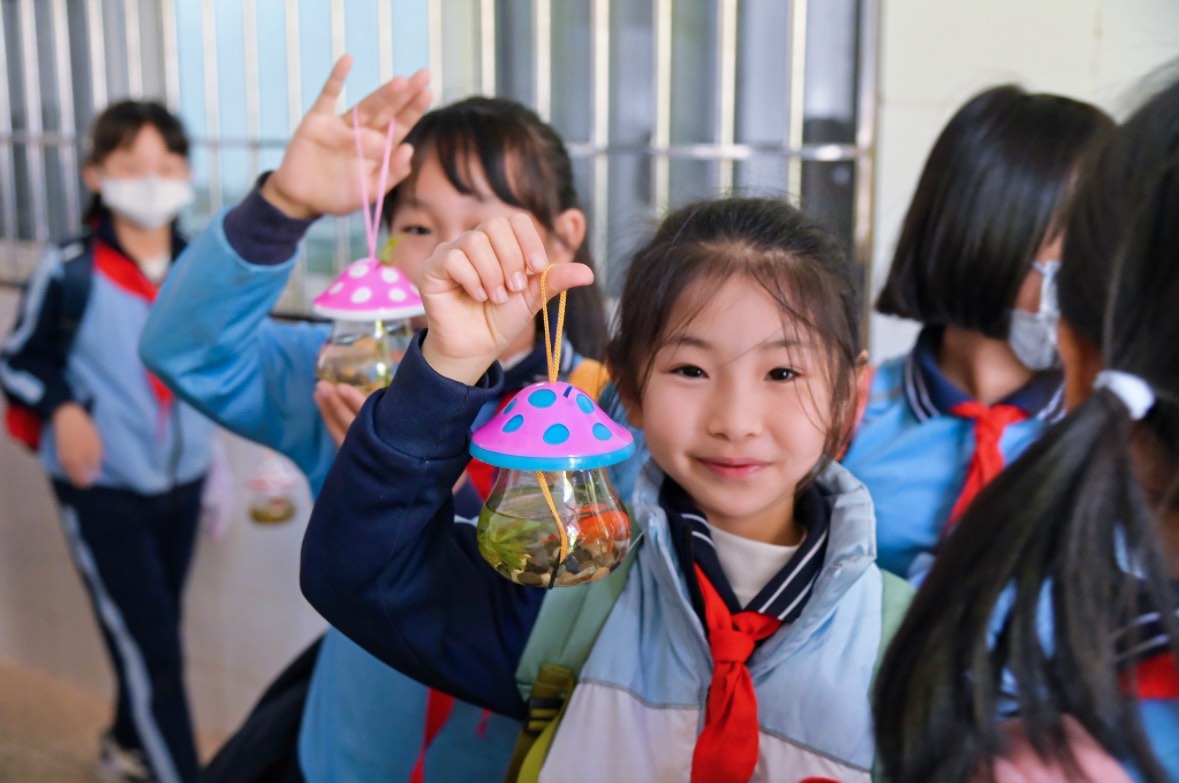 “瓶中海洋”环节,让微观世界的奇妙触手可及。在老师的指导下,孩子们认真挑选海洋植物、微生物与小巧的海葵、小鱼,一点点将它们放进透明生态瓶中。从调整光照角度让植物更好生长,到控制水质维持生物活力,每一个动作都充满专注。当孩子们发现,瓶里的“生产者”水草、“消费者”小鱼与“分解者”微生物相互依存,才能让这个小世界持续运转时,他们忽然懂得:哪怕是方寸空间里的生态,也藏着万物共生的大道理。