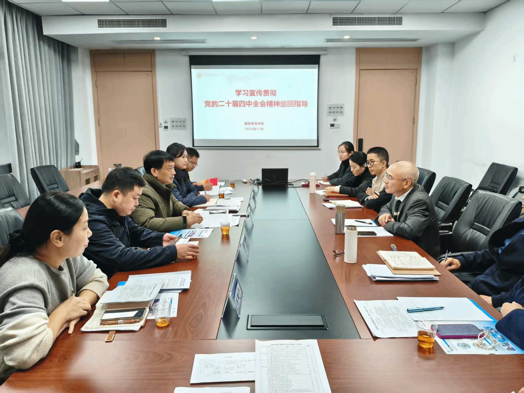 12月26日下午,校党委书记陈一端率学习宣传贯彻党的二十届四中全会精神校内巡回指导组莅临我院指导。学院副科级以上干部、党支部书记参加。