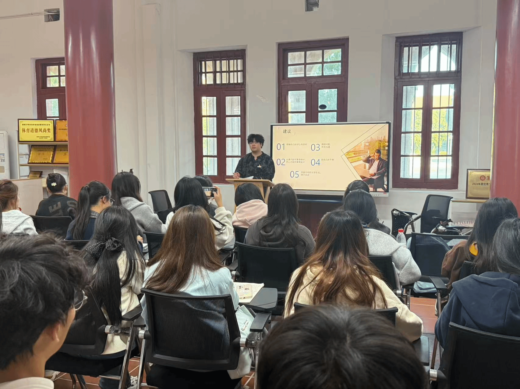 集美大学财经学院辅导员吴达鹏老师以“创新能力培养与职业发展”为题作专题分享。他围绕科创项目选题、实践路径和创新能力培养等内容展开讲解,既有理论深度,又有实践指导意义,为入党积极分子学业规划和职业发展指明方向。