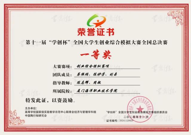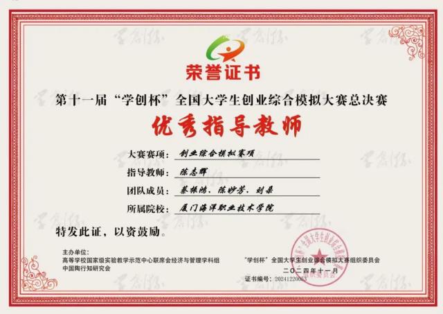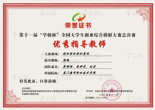 近日,第十一届“学创杯”全国大学生创业综合模拟大赛全国总决赛(职教组)在柳州职业技术大学顺利落下帷幕,我院跨境电子商务专业学生蔡振鸿、陈妙芳、刘朵组成的参赛队作为福建省高职院校唯一进入总决赛的队伍,在比赛中不负众望、脱颖而出,实现了学校首次参赛便获国赛一等奖的新突破,指导教师陈志辉、周敏荣获优秀指导教师奖。