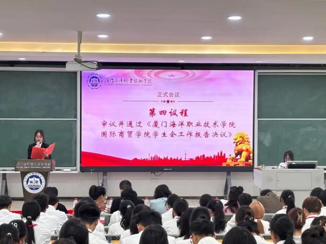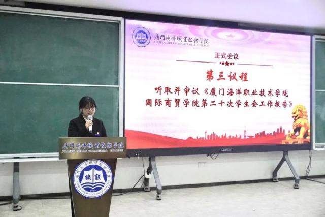 余晓玉同学代表第二十届学生会作“青春逢盛会,致远向未来”主题报告,报告系统总结回顾了国际商贸学院第十九次学生代表大会召开以来的学生会工作,并提出未来新征程上组织改革建设的主要任务,希望新一届学生会干部遵照校主陈嘉庚先生“诚毅”校训,“诚以待人、毅以处事”,以它作为行为准则和行动标杆,以高昂的奋斗热情投入到学习生活中去,以昂扬的斗志迎接下一个挑战,永葆爱国主义情怀,彰显蓬勃朝气、夯实干事底气,无悔新时代,不负好时光。
