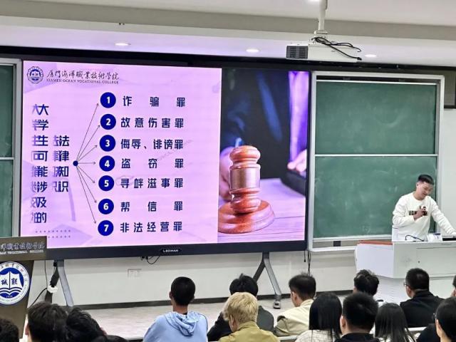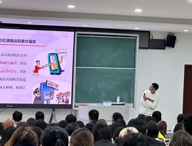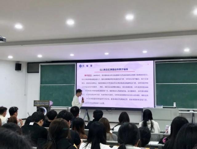 彭志勇老师是我院辅导员,法律专业硕士研究生,并高分通过了国家统一法律职业资格考试。他以案释法,以法论事,为同学们上了一堂生动形象的法治课。他从“小切口”入手,紧密联系实际,根据受众面的不同,多角度进行剖析,讲解了“诈骗罪”“故意伤害罪”“侮辱、诽谤罪”等大学生日常生活中可能触及的法律问题。他以生动诙谐的话语为同学们普及法律知识,深入浅出地解读典型案例,并结合现实进行分析总结,把法律讲出理论深度、文化厚度、情感温度,如同春风化雨,将法治观念深植于每一位学生心中,推动建设“学法、懂法、守法、用法”的法治校园。