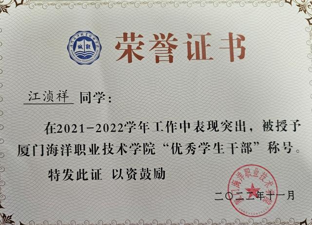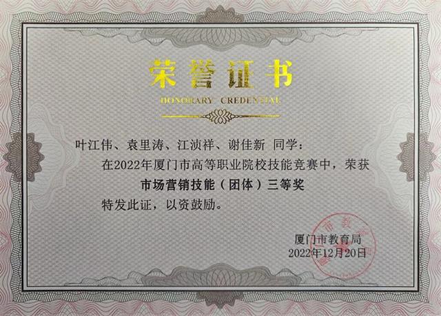 2021-2022学年荣获厦门市市场营销技能大赛三等奖;