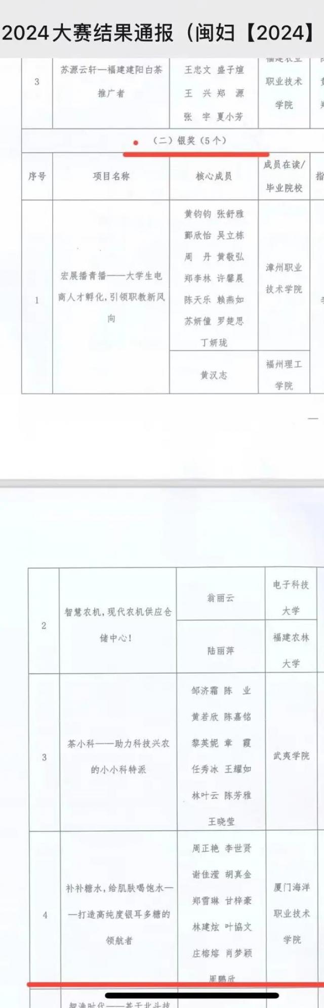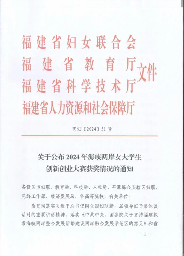 2024年8月14日,经过前期海选和决赛评审,由福建省妇联、福建省教育厅、福建省科技厅、福建省人社厅联合主办的“2024年海峡两岸女大学生创新创业大赛”获奖情况正式公布。历经激烈角逐,我校学生团队《补补糖水——打造高纯度银耳多糖的领航者》在本届赛事中斩获现代农业成长组银奖的好成绩。