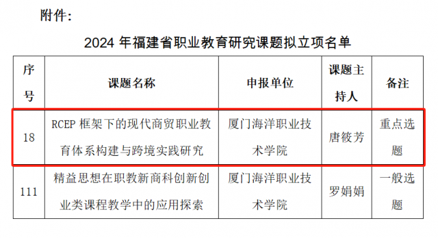 在福建省职业技术教育中心发布的2024年研究课题申报中,我校共5个项目获得立项,其中重点课题2项、一般课题3项。五个项目中分别有1个重点课题和1个一般课题为RCEP研究中心老师申报立项。