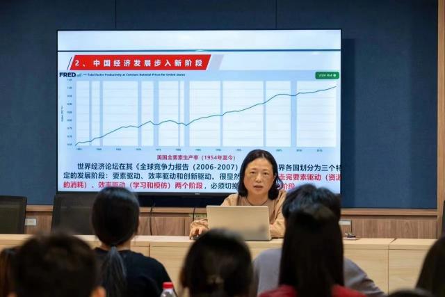 习近平总书记深刻指出,新质生产力是创新起主导作用,摆脱传统经济增长方式、生产力发展路径,具有高科技、高效能、高质量特征,符合新发展理念的先进生产力质态。为深入学习贯彻习近平总书记关于新质生产力重要论述,科学认识新质生产力,5月7日,国际商贸学院副院长(主持工作)徐薇开展《深刻认识和把握新质生产力,推进我国经济高质量发展》主题思政课。国际商贸学院党总支组织员彭幸子、23级入党积极分子和22级发展对象参加。