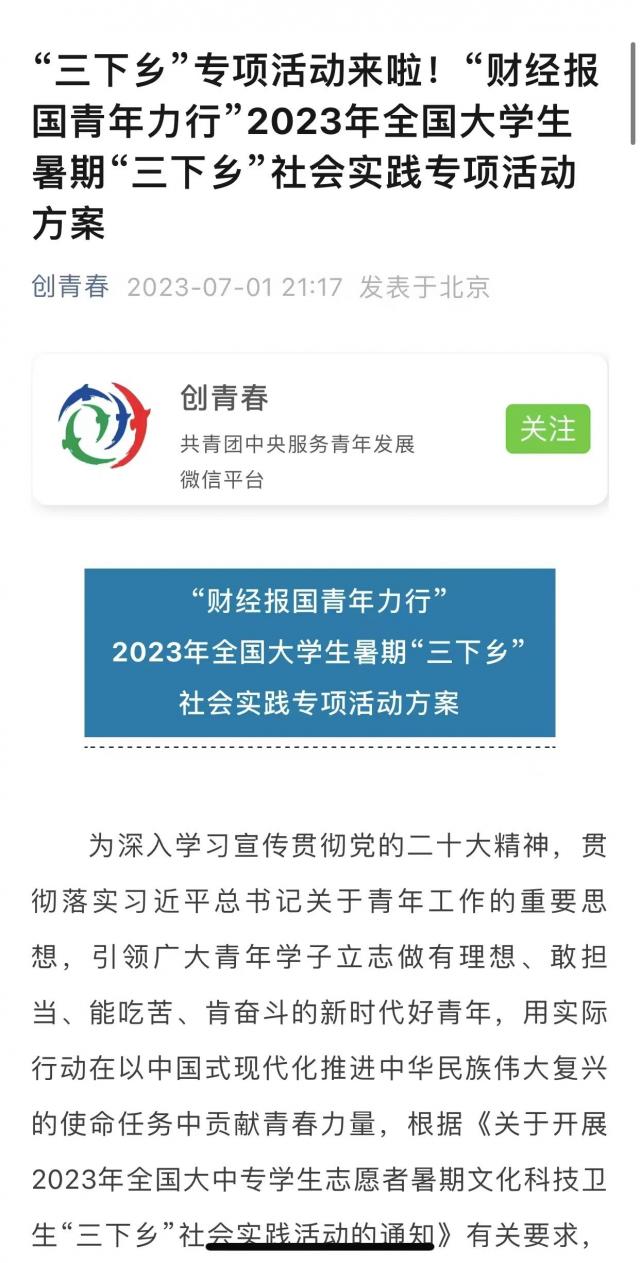 为深入学习贯彻党的二十大精神,贯彻落实习近平总书记关于青年工作的重要思想,引领广大青年学子立志做有理想、敢担当、能吃苦、肯奋斗的新时代好青年,用实际行动在以中国式现代化推进中华民族伟大复兴的使命任务中贡献青春力量,根据《关于开展2023年全国大中专学生志愿者暑期文化科技卫生“三下乡”社会实践活动的通知》有关要求,结合财经类高校工作实际,全国财经类高校共青团工作联盟于2023年暑期开展“财经报国青年力行”专项实践活动。