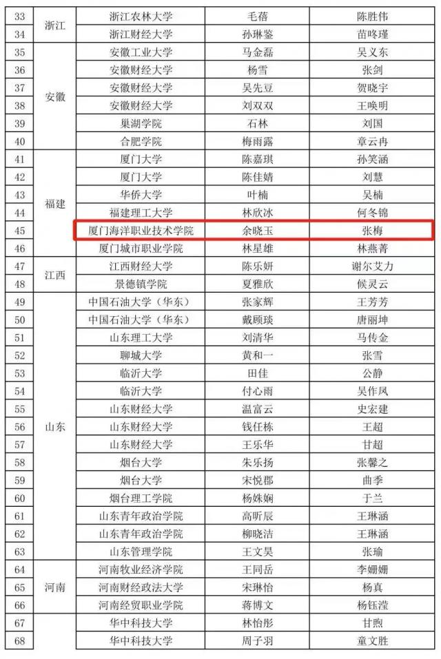 厦门海洋职业技术学院国际商贸学院“知行方见”暑期三下乡社会实践团队成为福建省入选的六支团队中的其中一支队伍。厦门海洋职业技术学院国际商贸学院“知行方见”暑期三下乡社会实践团队是由张梅、刘婷两位老师带队,团队成员包括余晓玉、范雯丽、李烯、蒋起用等18位成员。在暑期三下乡活动中,实践队协助厦门卫视、厦门国贸研学一起完成“少年自然说”这一档节目的暑期赛前集训活动。