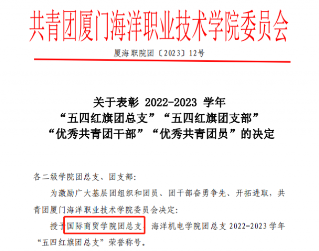 为充分发挥先进典型示范引领作用,激励广大团组织和团员、团干部踔厉奋发、创先争优,我校团委表彰了一批先进团组织和团员、团干部。我院团总支从层层遴选中脱颖而出,荣获2022-2023学年“五四红旗团总支”称号。这是继2021-2022学年以来,我院团总支又一次获此殊荣,这也是我院一代代团干薪火相传、接续奋斗的光荣成果,是我院青年永远跟党走、奋进新征程的真实写照和生动缩影。