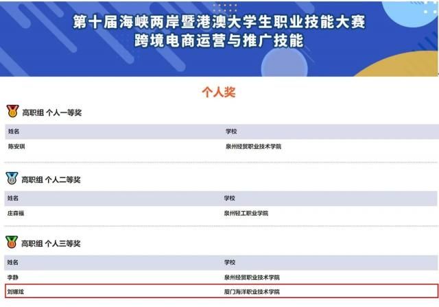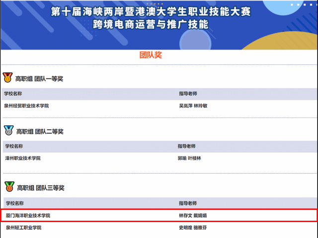 10月21日,由福建省教育厅、福建省人力资源和社会保障厅、平潭综合实验区管委会主办的第十届海峡两岸暨港澳大学生职业技能大赛--跨境电商运营与推广技能于福州顺利完赛。我院林存文、戴娟娟老师指导,跨境电商协会四位成员钟艳莹、蔡嘉鹏、刘娜炫、林雅婷组成的队伍在赛场上沉着应战、默契配合,经过激烈地角逐,最终以总分第三的成绩获得该比赛团体三等奖,刘娜炫同学荣获个人赛三等奖。