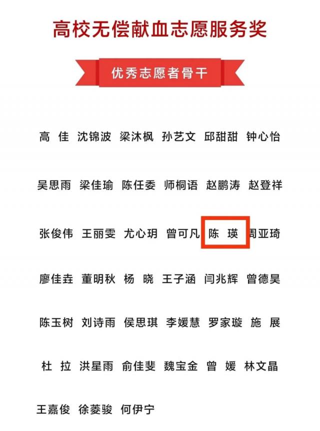 此外,6月4日,2023年厦门市高校无偿献血宣传骨干培训暨表彰活动举办,20个高校无偿献血优秀组织团体、39位高校无偿献血优秀志愿者骨干、165位高校无偿献血优秀志愿者及部分高校无偿献血优秀宣传作品获得表彰。其中,陈瑛获“高校无偿献血优秀志愿者骨干”荣誉。