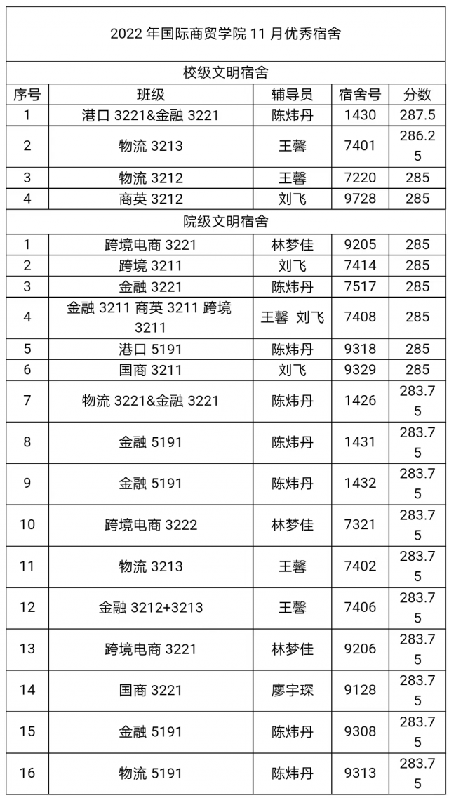 ​为加强学生宿舍文化建设,发挥宿舍阵地在学生成长成才中的重要作用,进一步调动学生参与宿舍文明创建的积极性、主动性和创造性,营造文明整洁、和谐向上的宿舍氛围,我院自律会督导部开展了“十一月文明宿舍”评选活动,经过多次宿舍文明卫生检查综合打分,评选出以下文明宿舍:
