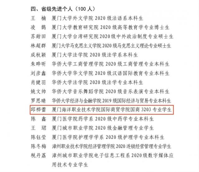 近日,在共青团福建省委发布的《2022年福建省大中专学生志愿者暑期“三下乡”社会实践活动优秀工作典型公示名单》中,我院国际商务3203班邱桦蕾同学荣获“省级先进个人”荣誉。