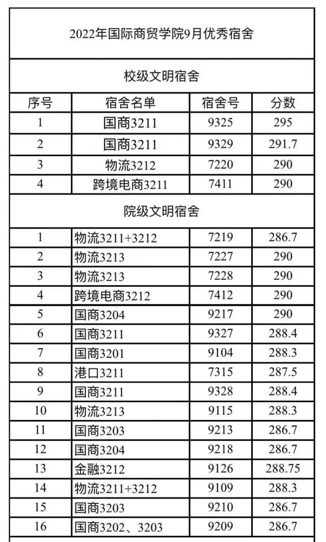 为营造“安全、文明、卫生、舒适”的宿舍环境,倡导文明向上、温馨和谐的宿舍文化氛围,国际商贸学院自律会督导部开展了“九月文明宿舍”评选活动,经过多次宿舍文明卫生检查,根据综合打分,评选出以下文明宿舍: