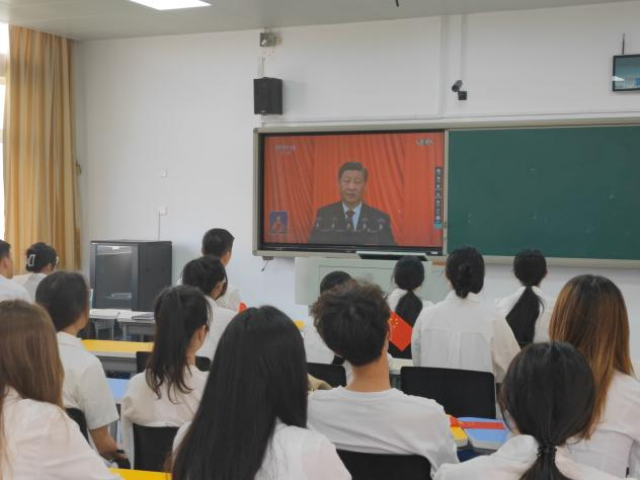在开幕会进行时,师生代表仿佛置身于大会现场,与大会代表一同高唱国歌,为已故老一辈无产阶级革命家和革命先烈默哀,聚精会神听报告、全神贯注做笔记,时而激动不已,时而豪情满怀,不时爆发出热烈的掌声。