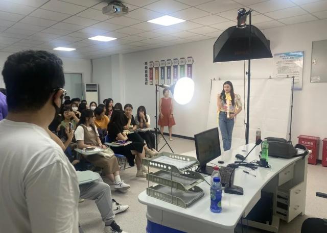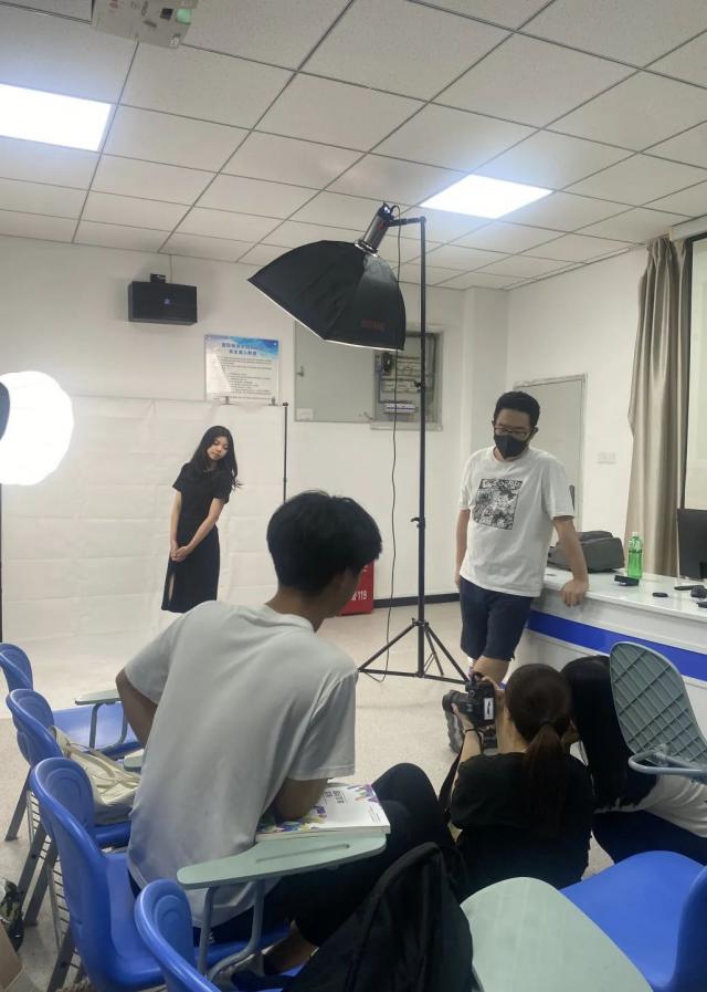 在杨老师的建议下,学生们分成十个小组,每个小组选出一名模特负责展示,其他学生进行人像摄影。杨老师先带领担任模特的学生调整出适合他们自己的站姿、眼神、动作等,而后指导负责摄影的学生如何使用单反相机及调试相机参数,并使用实训室的打光器材打出更合适的光线,以拍摄出更完美的模特人像。经过老师的一番专业指点,学生们的拍摄水平和模特的仪态都有了很大的提升。