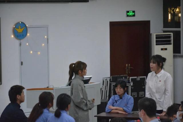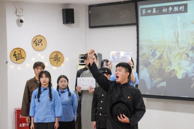 金融3212团支部带来《觉醒》。一名女老师带着一群学生因战乱躲避在一所破庙里上课,在破败的环境里,学生们更加坚定了想要加入中国共产党的队伍。在故事的最后,老师重返课堂为新一代学生上了一堂有意义的课程“开天辟地”。