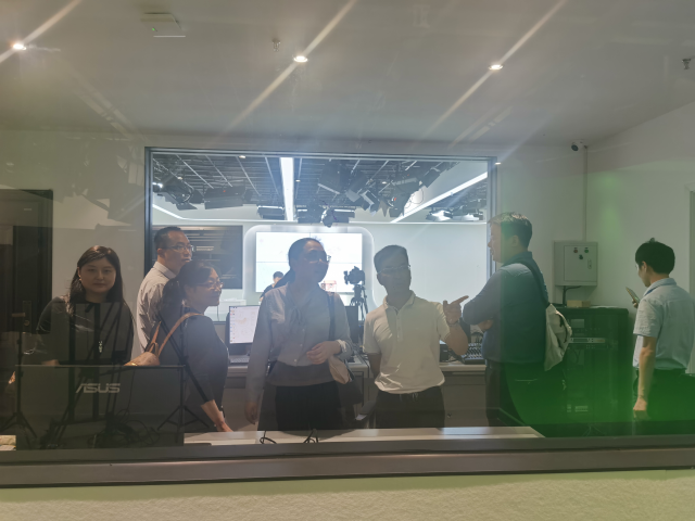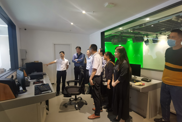 该企业从事新媒体内容的生产与运营,位于四海智慧园的直播基地包含两个大型演播厅式的直播厅及绿幕背景录影大厅。据悉,该直播基地承接多个知名品牌的社交媒体营销和直播。在本次调研中,企业负责人向老师们介绍了直播电商的模式和流程,商英专业老师们在导播间实地观看了主播带货的试播过程。