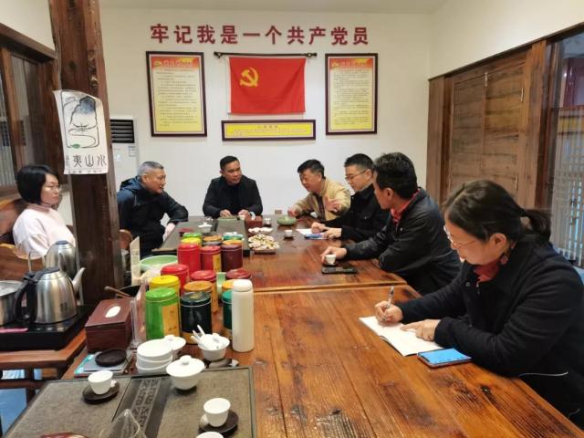 调研第一站是武夷山黄村村。座谈会上,茗川世府生态茶业农民专业合作社理事长黄正华首先介绍了黄村党建示范点茗川世府合作社的发展模式,由过去的单打独斗到报团取暖、再到如今抱团发展、助力发展的模式,以及“党支部+合作社+茶农+互联网”的运作模式,最后希望中心在茶叶营销、茶旅融合等方面能助力合作社发展。徐庆生充分肯定了黄村村的发展模式与运作模式,表示将充分发挥高校优势,助力黄村村茶产业发展与升级。