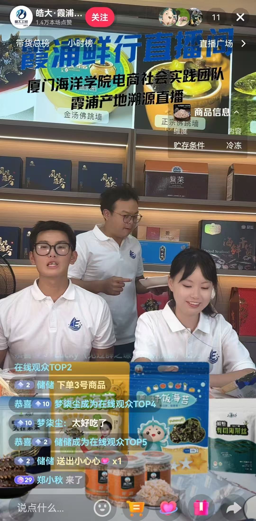 直播“首秀”告捷:实践队精心策划并成功为合作企业开展海产品专场直播。直播间气氛热烈,互动频频。
