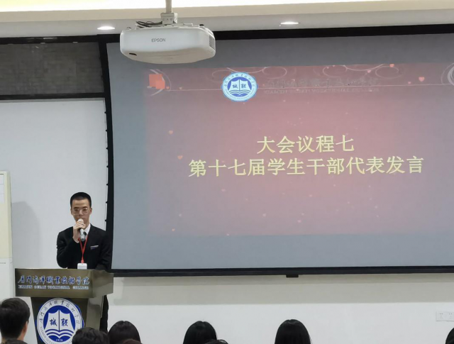 我院第十七届学生会主席刘志凌发言,表示要以学长学姐们为榜样,同新一届的学生会干部们一起促进学生会发展得更好。