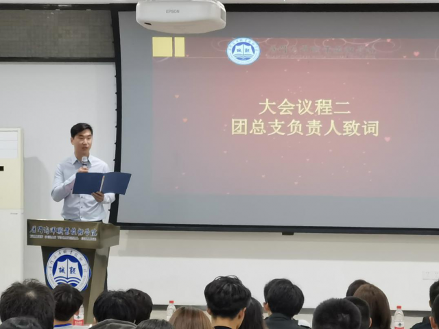 我院第十六届学生会主席黄榕鸿上台总结工作并希望新一任学生会干部们能够增强自我管理的能力,明确责任,与学生会成员互相理解、互相尊重、和睦相处。