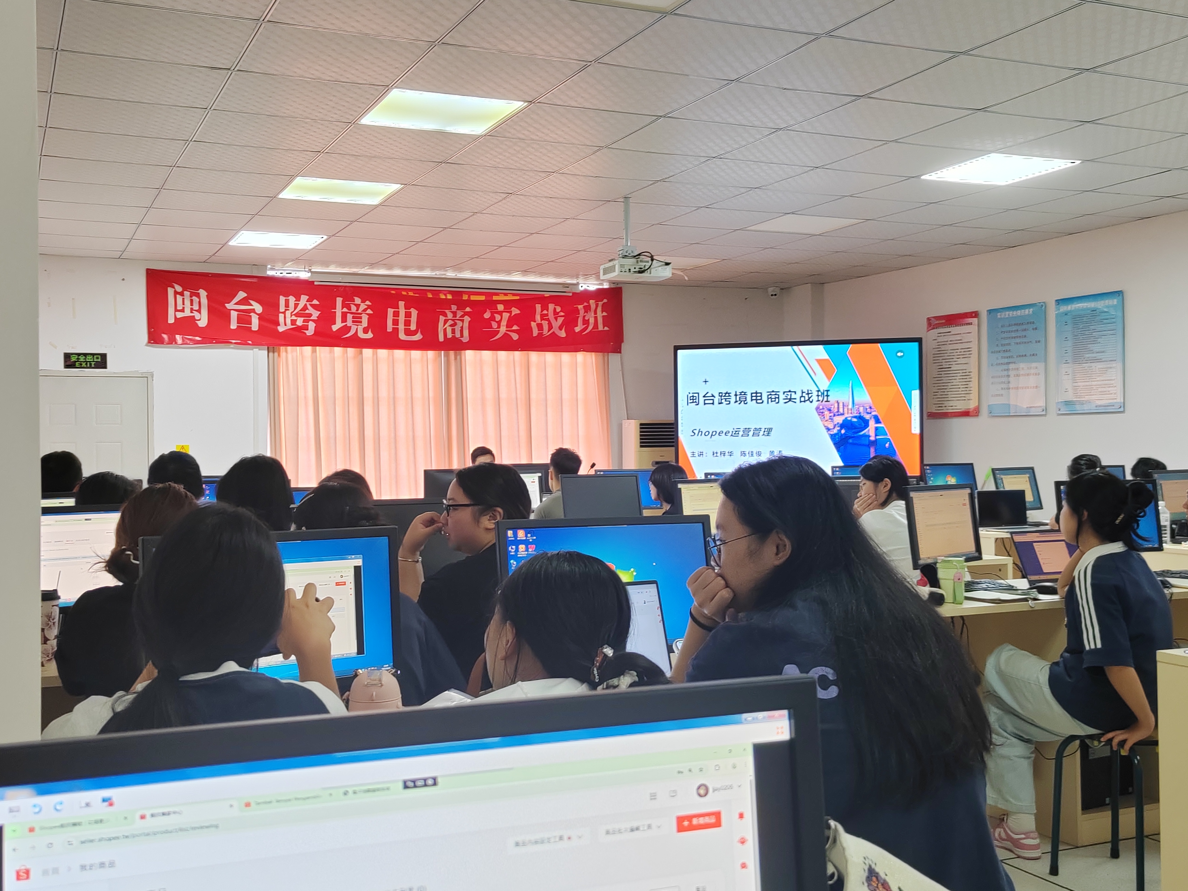 10月9日下午,由厦门海洋职业技术学院国际商贸学院与厦门森山丘科技有限公司(台企)、厦门优印贸易有限公司(台企)联合举办的“闽台跨境电商实战班”在翔安校区跨境电商实训室正式开课。来自学院的33名学员迎来了首场项目培训课程——中国台湾Shopee新手卖家入门课程。本次课程由企业导师杜梓华(运营总监)、陈佳俊、黄涛三位导师同台授课,围绕中国台湾市场宠物饰品行情、AI赋能Shopee店铺运营、选品策略、店铺设置及美工视觉设计等方面展开深入讲解。
