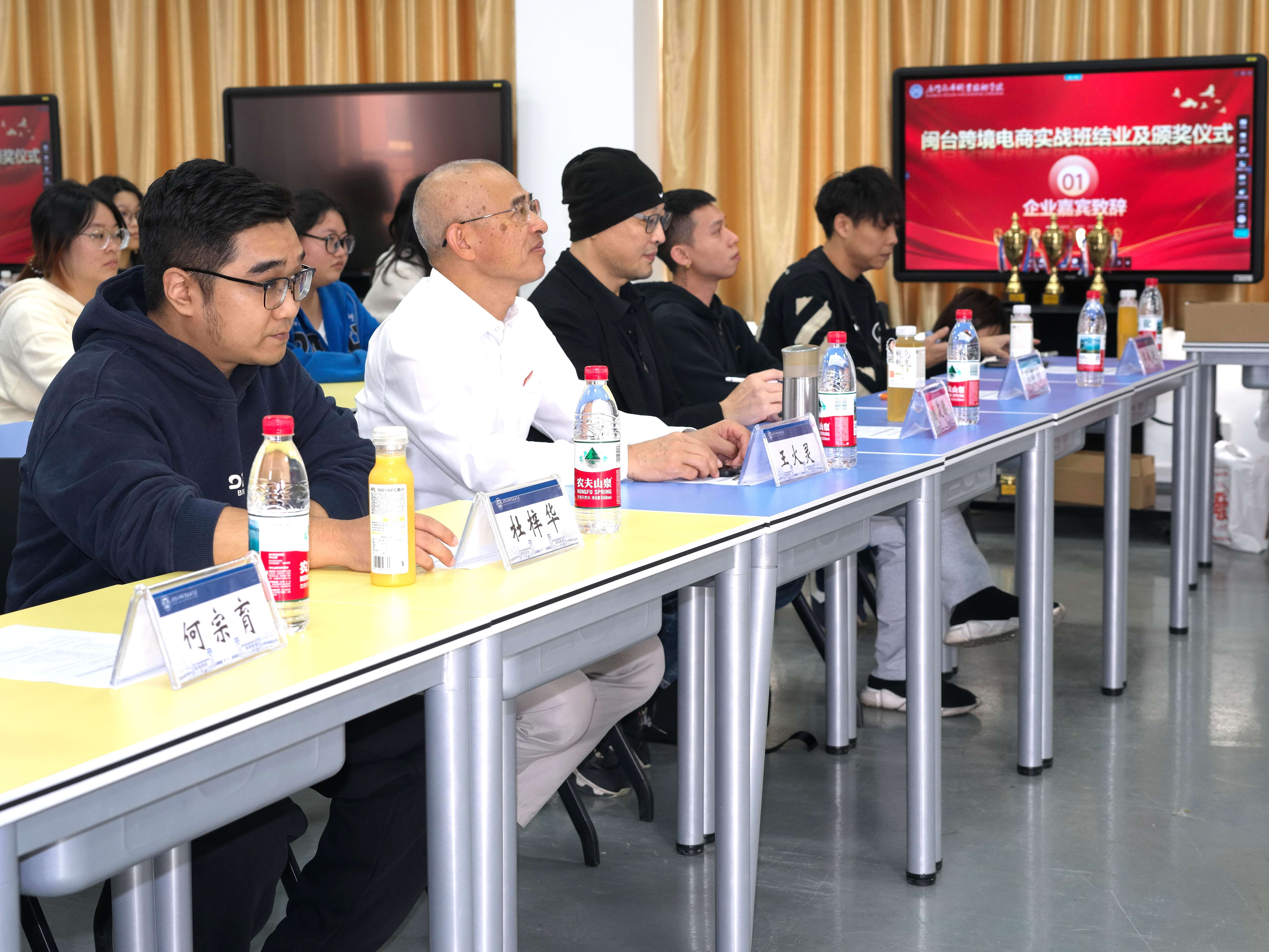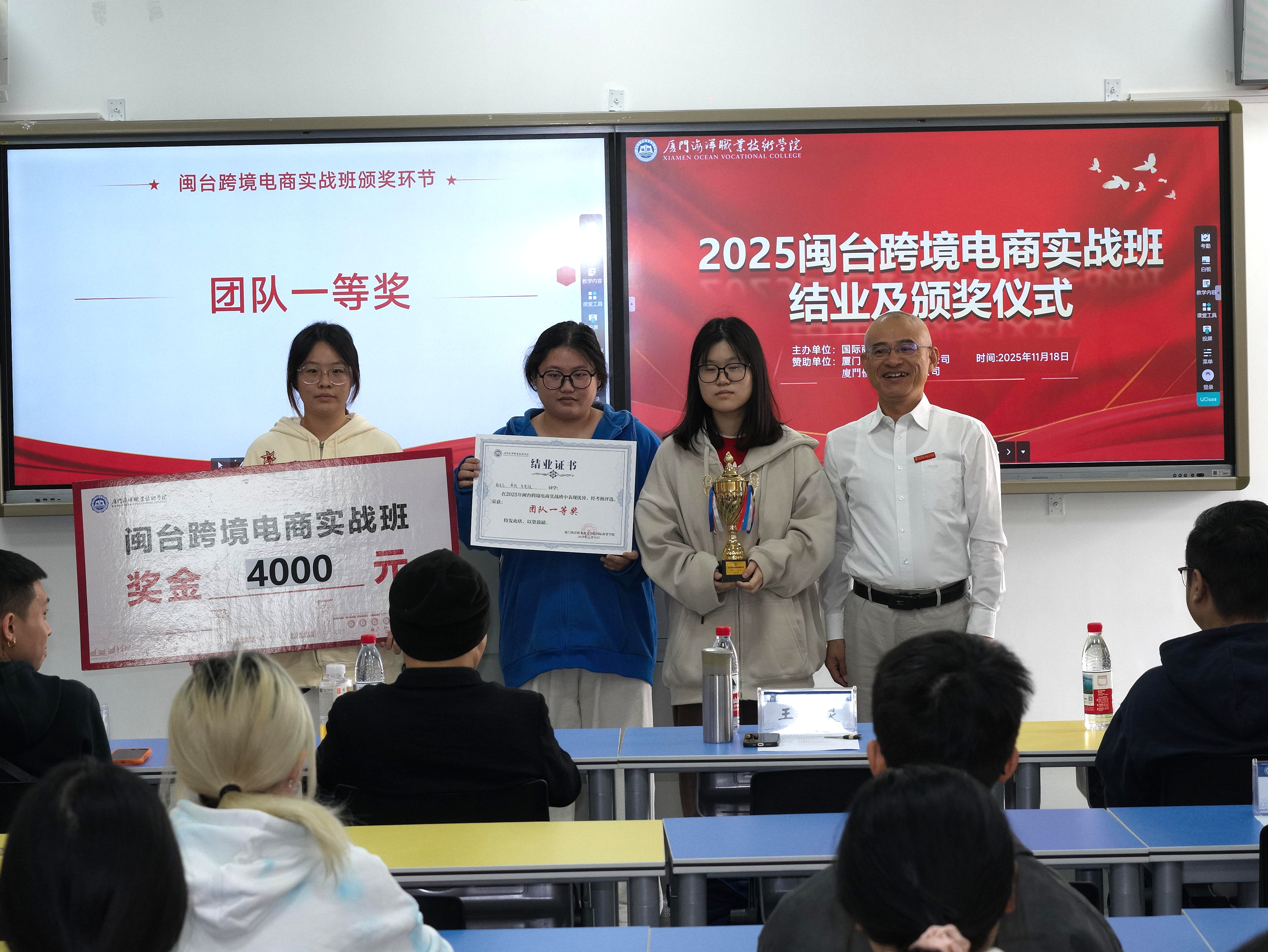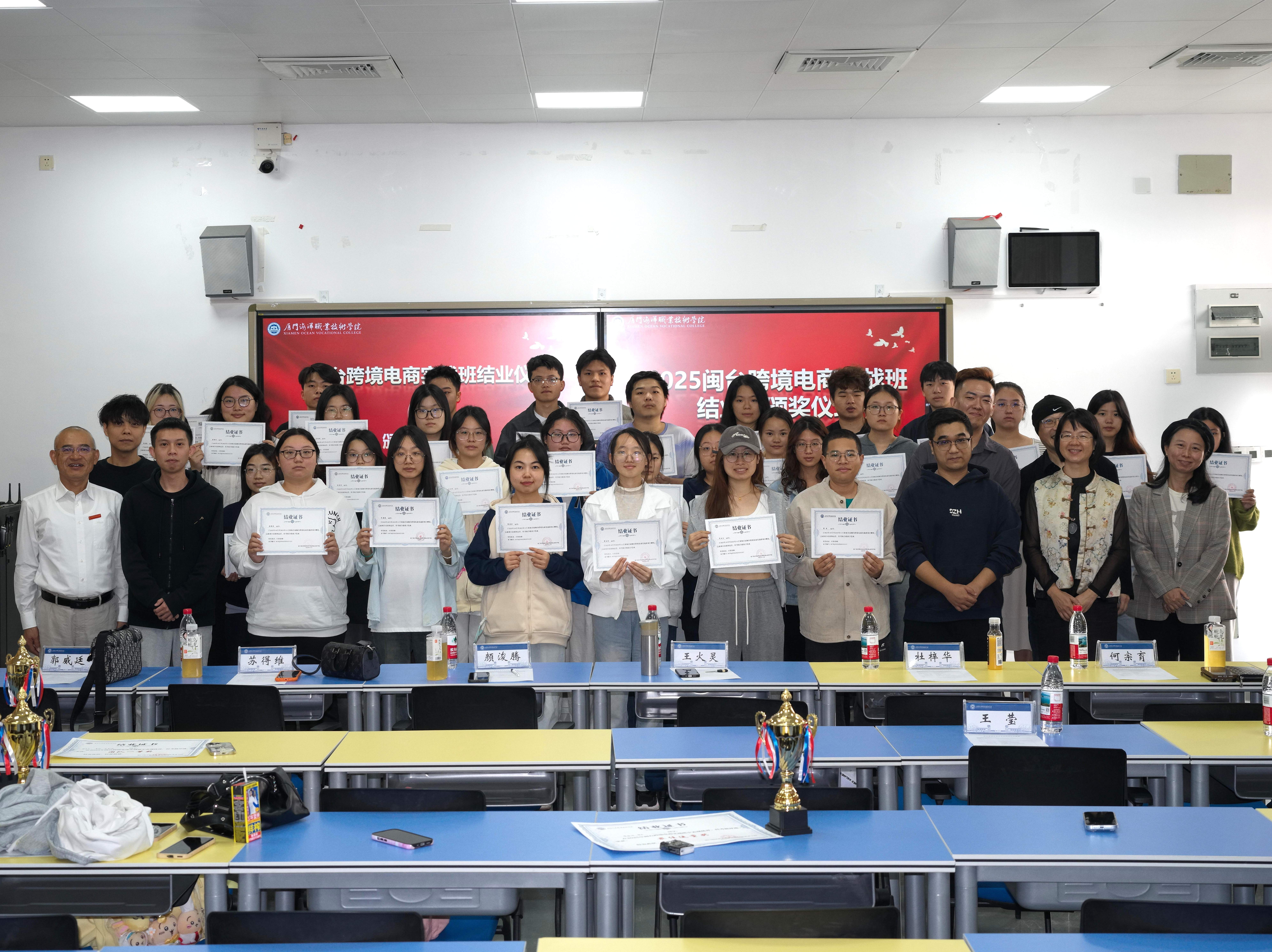 11月18日下午,由国际商贸学院和厦门森山丘科技有限公司、厦门优印贸易有限公司共同举办的“2025闽台跨境电商实战班”结业暨颁奖仪在翔安校区智慧教室3501举行。学院党总支书记王火灵,企业代表颜浚腾、杜梓华、郭威廷、何宗育、苏得维及项目全体师生出席。