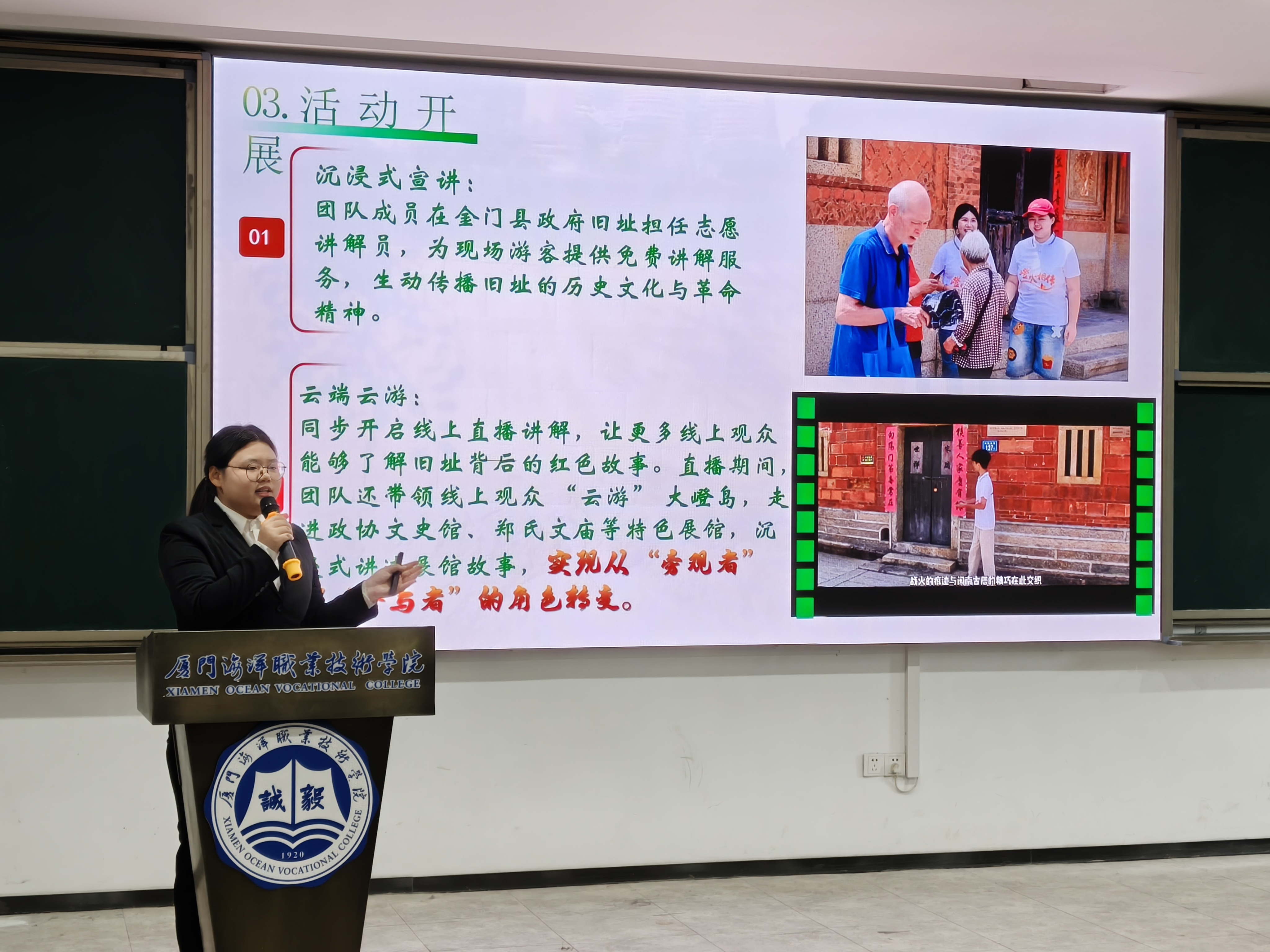 10支实践团队依次上台进行汇报,评委老师从“三下乡”服务成果、PPT内容、现场汇报表现、视频制作等方面对各团队进行打分。
