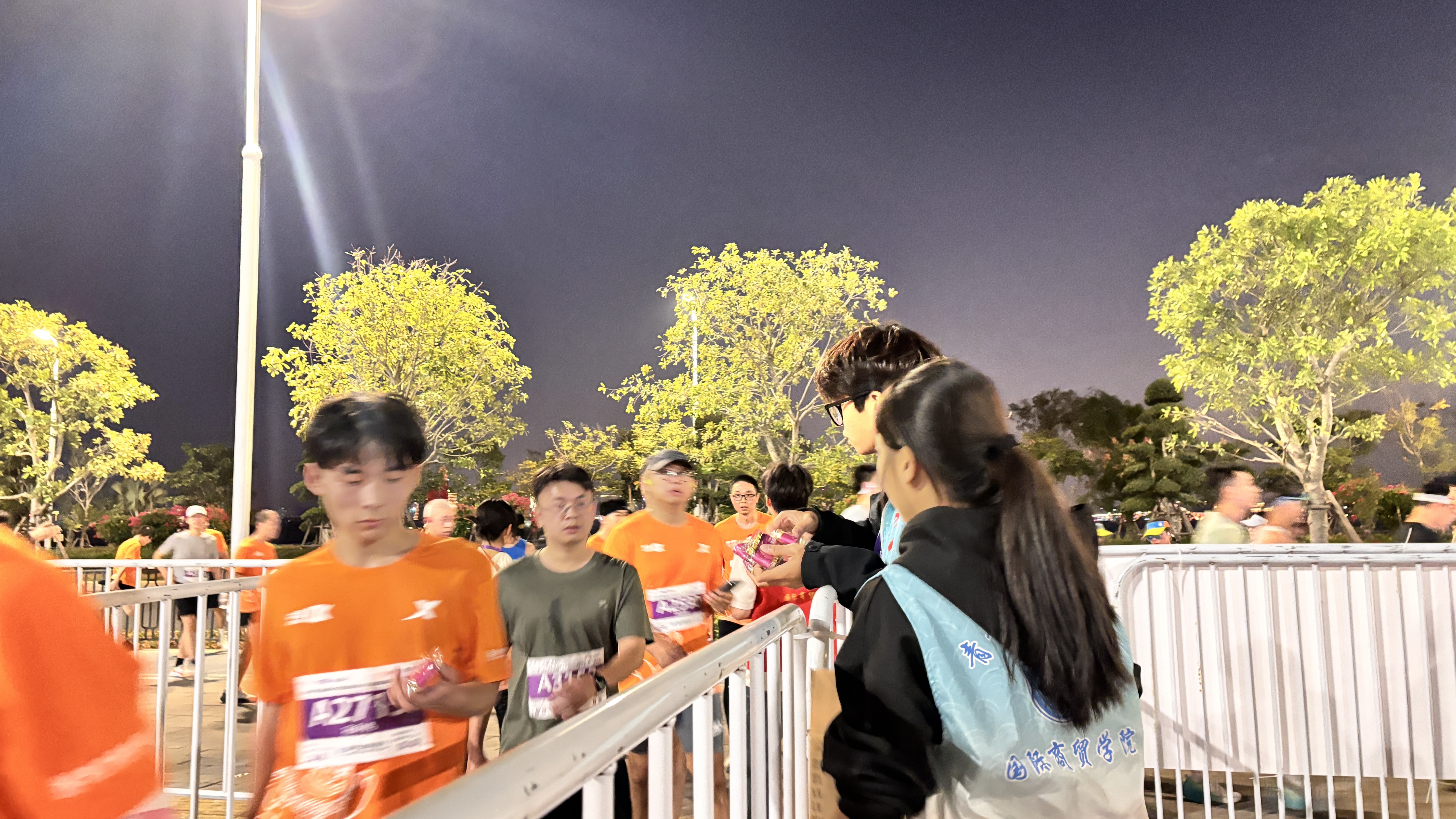 在厦门翔安10km精英赛中,商贸青协志愿者主要承担终点服务工作,从奖牌陈列、物资分发到完赛祝贺、补给提供,以细致入微的服务为选手送上“最后一公里”的温暖。一句“恭喜完赛”、一份能量补给,让疲惫的奔跑者感受到城市温度。