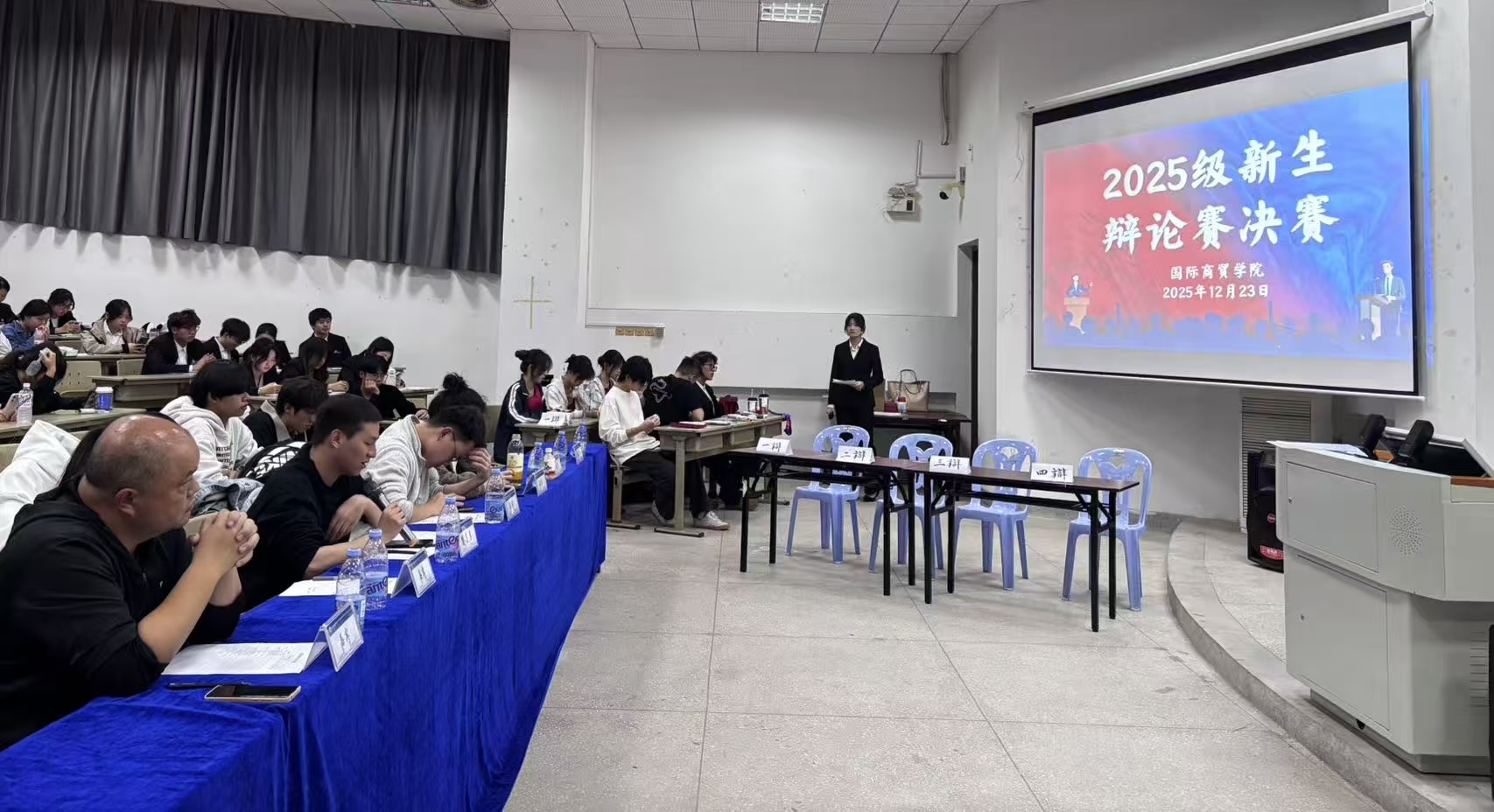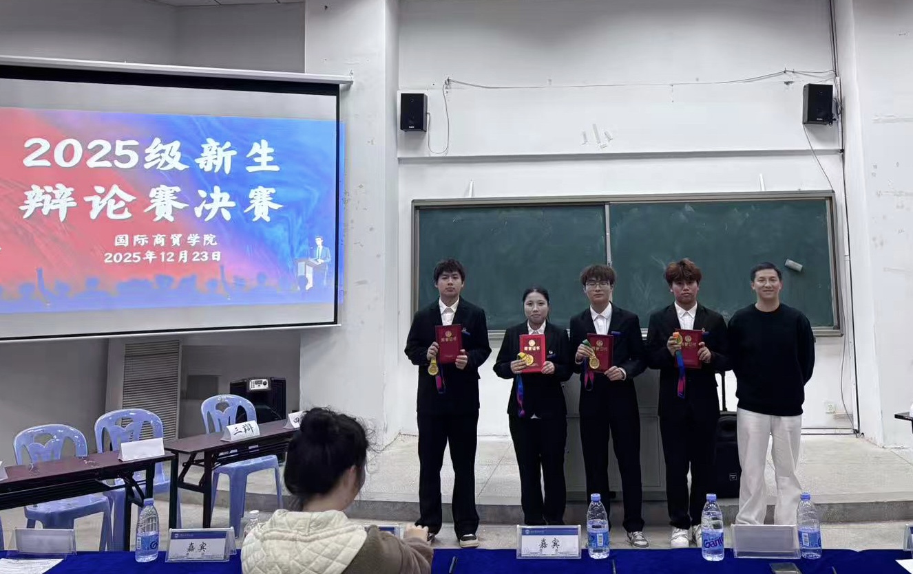 辩是非曲直,论古今方圆。 12月23日下午,国际商贸学院2025级学生辩论赛决赛在翔安校区举行。比赛邀请海洋生物学院邹璇,海洋机电学院傅传杰、许黄琛,国际商贸学院彭志勇、王海五位老师担任评委。