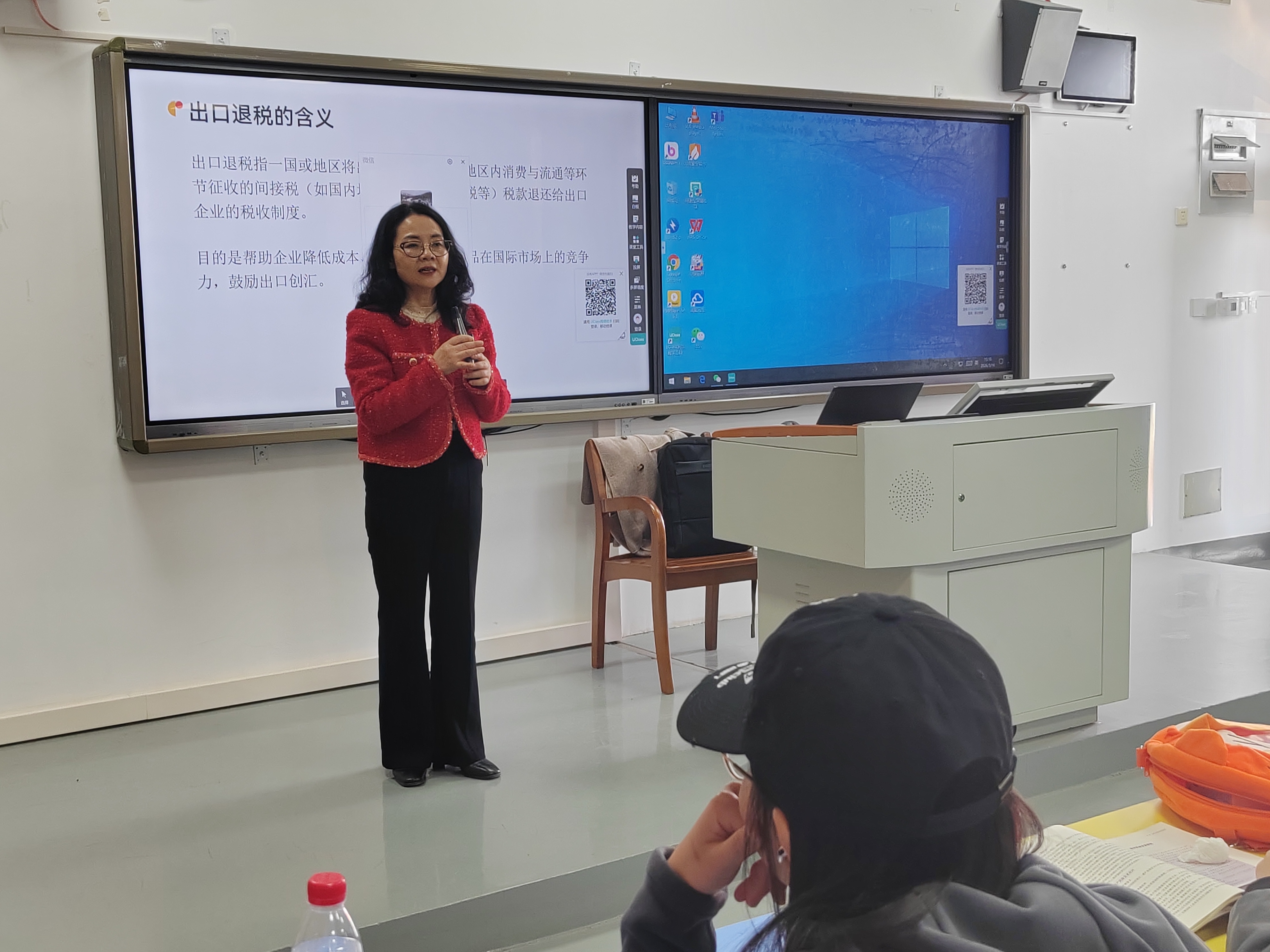 蒋冬梅是厦门经济贸易促进会的骨干成员,深耕外贸领域数十年,积累了丰富的企业实践经验与扎实的国际贸易知识功底。她以“出口退税风险及其防范”为主题,深入浅出地为同学们讲解出口退税的基本知识,并结合自身实际业务案例,详细剖析出口退税过程中的潜在风险点,并提出切实可行的解决思路与方案。她特别提醒同学们关注风险防控,尤其是出口退税为0%时的特殊情况处理,强调风险意识在国际贸易中的重要性。