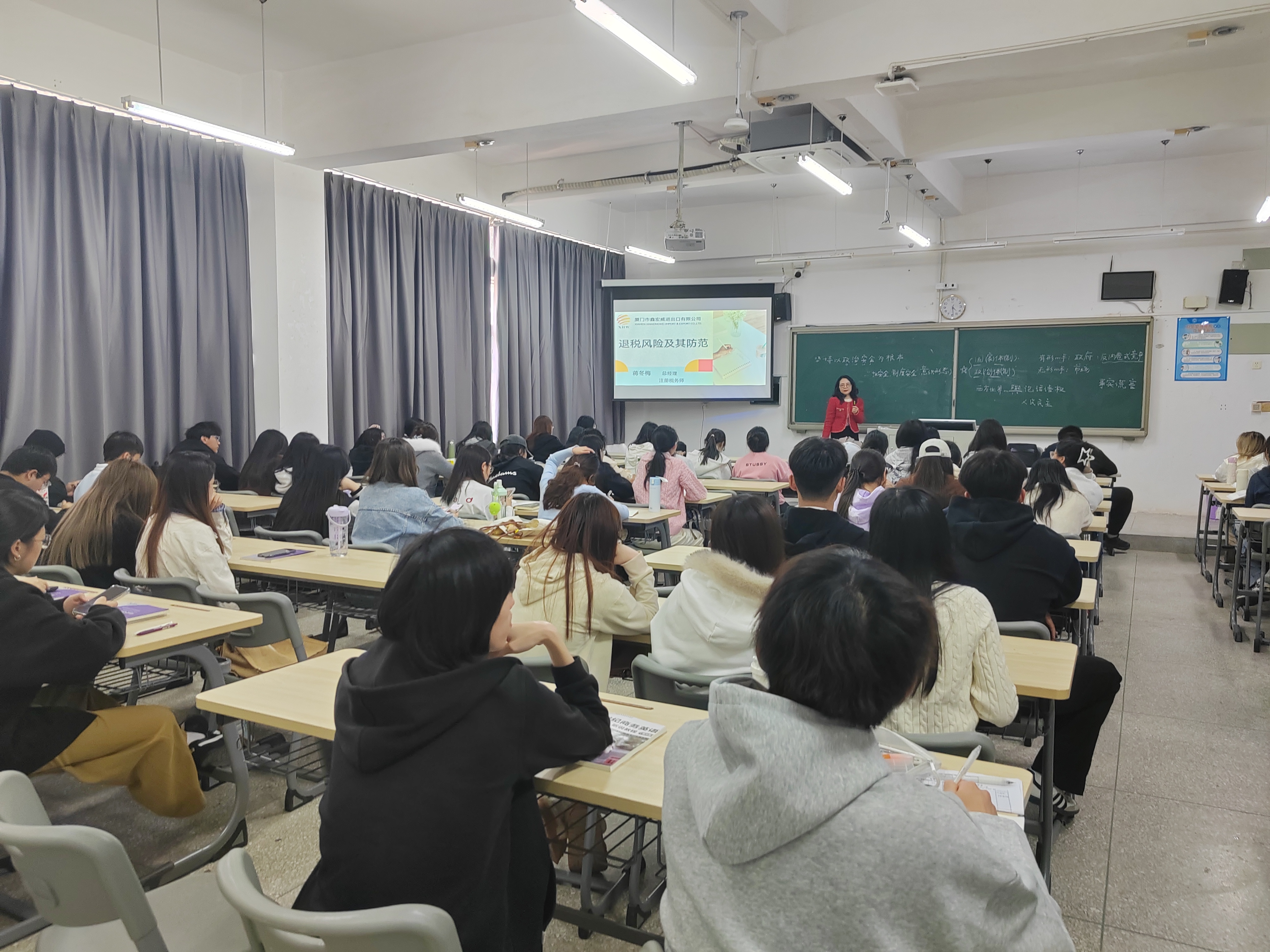 为进一步深化校企合作、协同育人,推动产教融合高质量发展,近日国际商务专业邀请厦门鑫宏威进出口有限公司总经理、注册税务师蒋冬梅女士,为国际商务3241、3242、3243班带来一场干货满满的《外贸风险管理》课堂。授课采用“1+N”企业专家模式,旨在通过企业一线专家的亲身经验分享,助力学生更好地将理论知识与实践相结合。